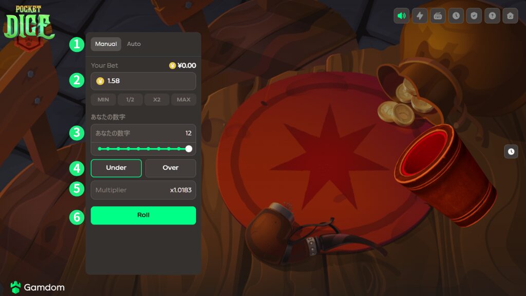 ガンダムカジノオリジナルゲーム『ポケットダイス』の手動によるゲーム画面の各機能は、以下の通りです。