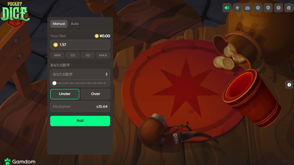 ガンダムカジノオリジナルゲーム『ポケットダイス』の最大倍率は、35.64倍です。通常の『ダイス』と比べると低めの設定となるため、ライトにプレイしたいときにおすすめですよ。